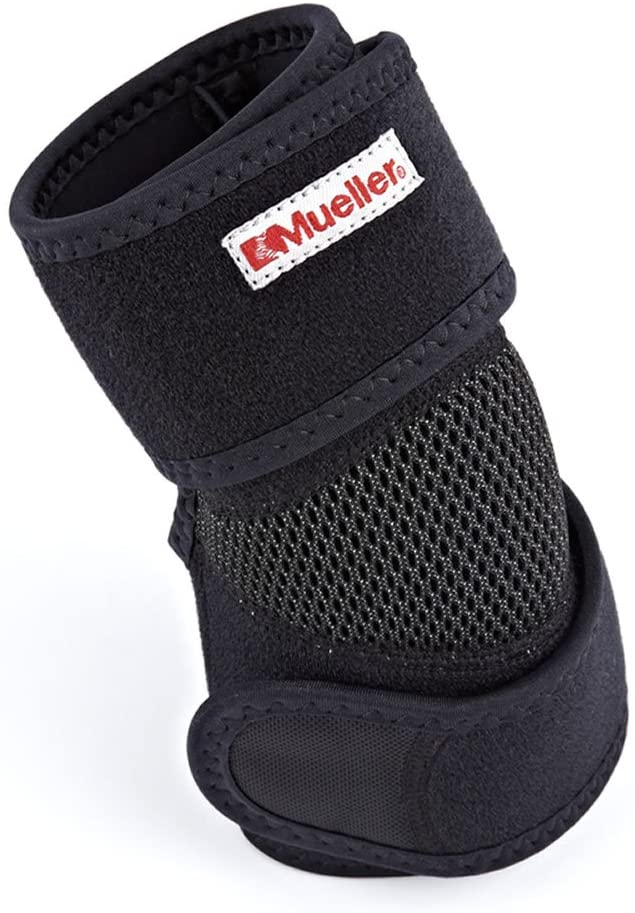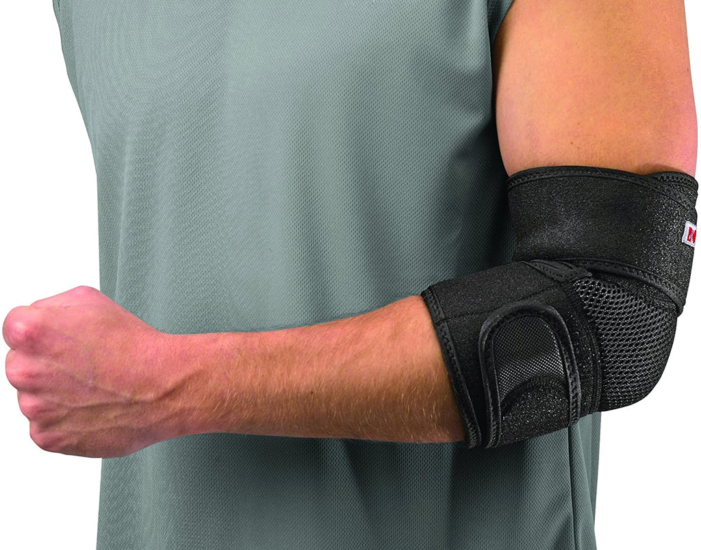 ● The Mueller Adjustable Elbow Support helps protect and support sore, weak, or injured elbows. Instructions - Unfasten both straps.Slide arm into support with Mueller logo positioned at top of arm and finally fasten straps around arm, above and below the elbow